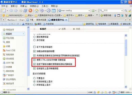 那么,我們有沒有更加快捷的頁面切換方式呢?其實,傲游瀏覽器還同時提供了快捷鍵切換和鼠標滾輪切換兩種更加靈活快捷的切換方式:用戶首先將打開的“傲游設置中心”頁面切換到“標簽欄”子頁面,然后分別選中“使用Ctrl+左右方向鍵切換標簽”和“在按下鼠標右鍵時使用滾輪切換標簽”兩個選項,這樣即可同時使用軟件提供的快捷鍵切換網頁頁面和使用鼠標滾輪切換網頁頁面的方式了,特別方便(如圖3)。