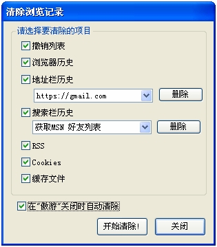 可刪除的選項有撤銷列表、歷史記錄、地址欄和搜索欄記錄,以及Cookies和緩存文件等。如果對安全還有更高的要求,則可以選中“在”傲游”關閉時自動清除”。