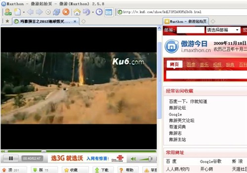 邊上班邊看《2012》,可瀏覽器只有一個,怎么辦?請在傲游上按F10執行“分屏”,左邊半個屏幕看《2012》,右邊半個屏幕照常進行網絡操作,左右半腦同時運轉,絲毫不誤事。