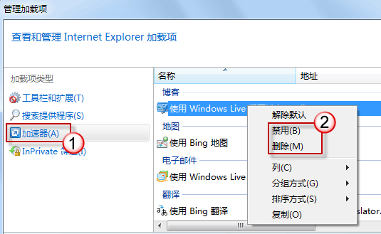 在管理加載項窗口左側,在“加載項類型”下選擇“加速器”。右邊窗口列出具體項目后,選中不需要的項目,右擊,選擇“禁用”或“刪除”。