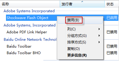 如果要禁用某個加載項,請先單擊選中,然后右鍵鼠標,選擇“禁用”。