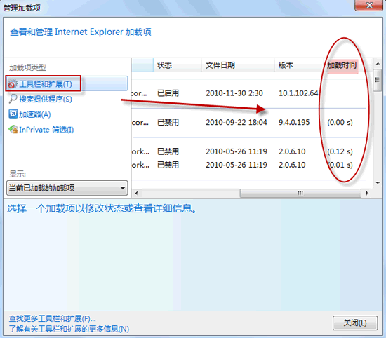打開“管理加載項”窗口后,在“加載項類型”下選擇“工具欄和擴展”。然后向右拉動滑塊,在每個加載項的最后我們可以看到加載所需的時間。如下圖所示: