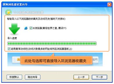 方法二:首次打開(kāi)搜狗高速瀏覽器時(shí),在設(shè)置向?qū)е屑磳?dǎo)入IE瀏覽器收藏,如圖所示。