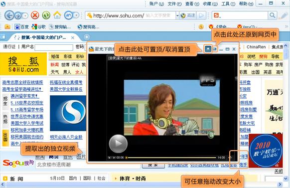 在看網頁視頻的同時看新聞的方法:鼠標劃過視頻時,視頻的右上角會彈出一個“打開視頻播放器”的按鈕,點擊即可以獨立播放器的模式觀看視頻,同時也不會影響正常瀏覽新聞;另外,通過點擊標簽和地址欄旁邊的“攝像頭”按鈕,也可以進行視頻提取,如圖所示。