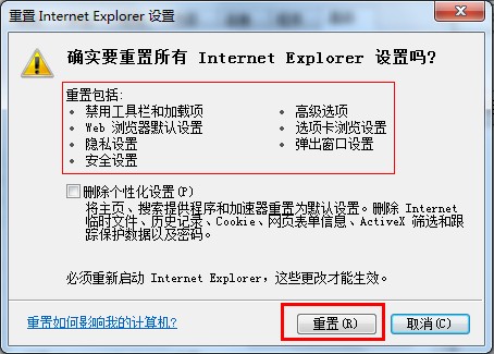 6. 在“重置 Internet Explorer 設(shè)置”對話框中,單擊“重置”。如果還希望刪除瀏覽歷史記錄、搜索提供程序、加速器、主頁、跟蹤保護和 ActiveX 篩選數(shù)據(jù),請選中“刪除個性化設(shè)置”復選框;