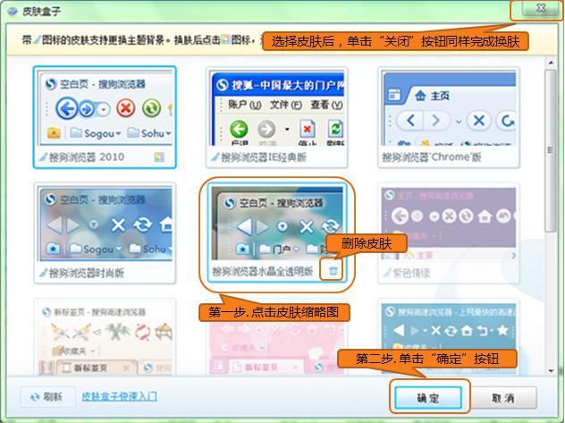 更換皮膚:點擊皮膚盒子中的皮膚縮略圖,瀏覽器會自動更換為您點擊的皮膚,點擊“確定”按鈕或皮膚盒子“關(guān)閉”按鈕,則完成換膚。點擊”取消”按鈕,皮膚會恢復(fù)為盒子打開前的皮膚。