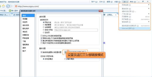 菜單選項中設置快速打開外部鏈接方法:點擊菜單欄工具選項,然后點擊搜狗高速瀏覽器選項;在常規的基本設置中,點擊“設置搜狗高速瀏覽器為默認”按鈕即可,如下圖所示。
