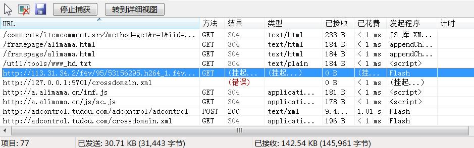 單擊“開始捕獲”按鈕,程序即可開始捕獲當前IE9瀏覽器頁面中的網絡通信,一般包括HTTP的請求及其返回的數據,例如網頁代碼及其相關的圖片、腳本等資源。不過,如果這時候頁面已經打開完成,則不會有網絡通訊行為,這里不會顯示任何結果。