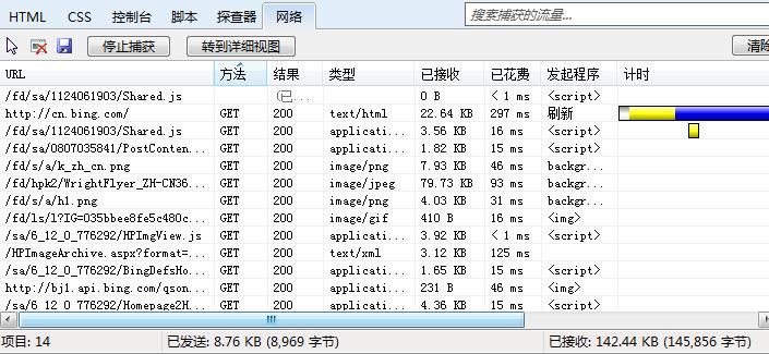 默認看到的摘要視圖中,會列出所有已經捕獲到的HTTP請求和接收行為。當我們訪問Bing主頁時,會得到這樣的結果: