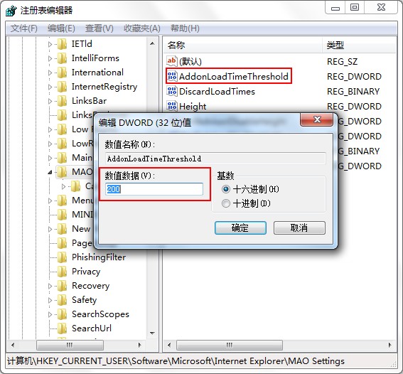 在右側窗口,雙擊AddonLoadTimeThreshold值,把DWORD值改為十進制,值數修改為200(默認的0.2秒標準時間)。