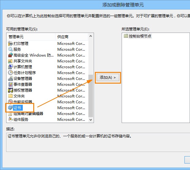 3、在彈出的窗口左側列表中選中“證書”在點擊“添加”;