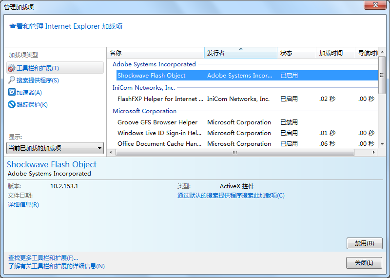 當關閉當前站點的 ActiveX 篩選以后,若還出現Flash打不開的情況,可以檢查IE9的管理加載項,看Flash插件(Shockwave Flash Object)是否被禁用了,右鍵點擊它可以啟用Flash插件。