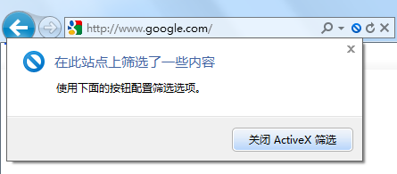 如果用戶有心,是可以在地址欄里看到對應的藍色提示圖標的,如下圖所示。點擊它可以對當前站點進行 ActiveX 篩選的設置。
