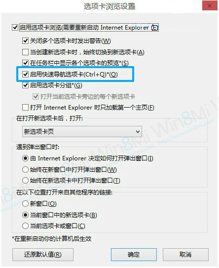 IE10瀏覽器-Internet選項-常規-選項卡-選中“啟用快速導航選項卡”-確定-然后按住快捷鍵Ctrl+Q,就會出現導航界面。