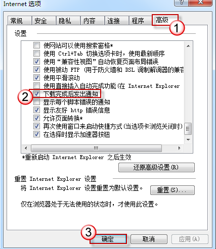 切換到“高級(jí)”選項(xiàng)卡,從設(shè)置欄中找到并勾選“下載完成后發(fā)出通知”復(fù)選框。單擊“確定”保存修改。OK!