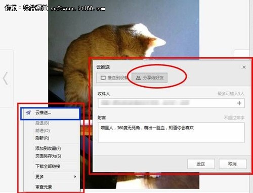 在傲游云瀏覽器上,選中你想要分享的圖片,點擊右鍵“云推送”——“分享給好友”。現在你只需選中將要分享的內容,輸入TA的聯系方式,不管是手機號碼、傲游賬號還是郵箱,分享就是這么簡單!同時在分享中,你還可以加上給TA的附言,但切記不能超過30個字哦。