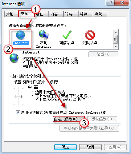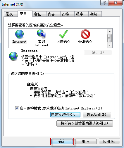 切換至“安全”選項卡,選中“Internet”區(qū)域,然后單擊“自定義級別”按鈕。