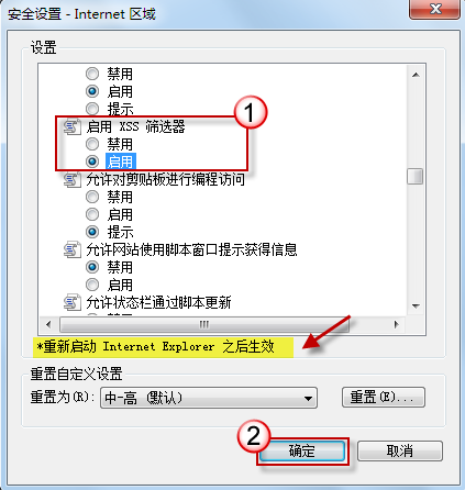 在“腳本”項下,找到“啟用 XSS 篩選器”,選擇“啟用”。按“確定”保存修改。