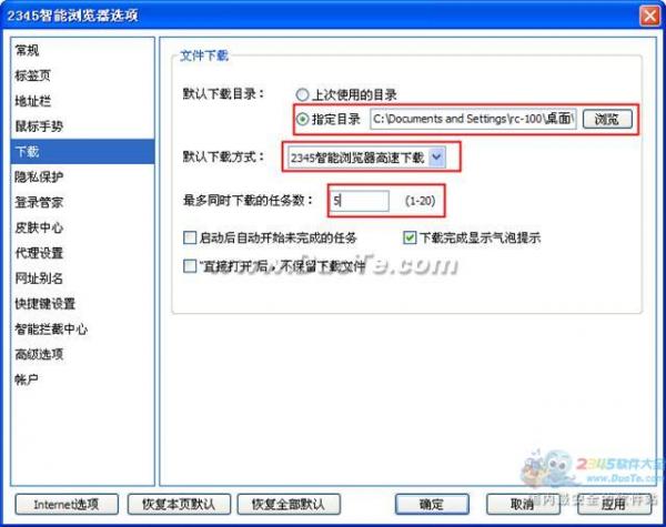 3、在2345智能瀏覽器選項(xiàng)中,可以對(duì)下載文件目錄、下載方式等進(jìn)行設(shè)置,如下圖所示:
