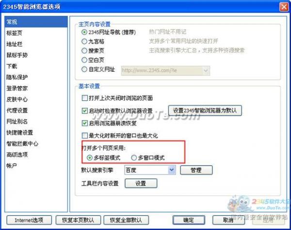 打開(kāi)“2345智能瀏覽器選項(xiàng)”,在“常規(guī)”選項(xiàng)中設(shè)置網(wǎng)頁(yè)打開(kāi)模式,單擊“確定”后就可以完成設(shè)置。