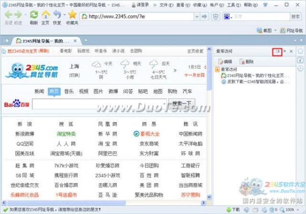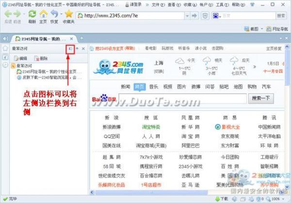 2345智能瀏覽器的側邊欄提供 收藏夾、最常訪問、歷史記錄的點選、訪問添加、刪除等操作,更有可左可右的功能,來適應不同人的習慣。