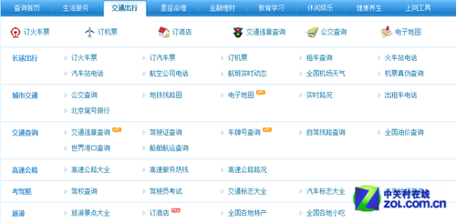 點(diǎn)擊“網(wǎng)址導(dǎo)航”之后我們找到“查詢”選項(xiàng),這里有我們經(jīng)常要用到的查詢內(nèi)容,不過(guò)我們今天不管別的,只管搶票。點(diǎn)擊“交通出行”標(biāo)簽,火車(chē)票、汽車(chē)票、飛機(jī)票、酒店公交等等都展現(xiàn)在我們面前,這種訂票大全的感覺(jué)真是好。
