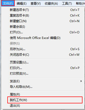 5、ie被脫機無法瀏覽網頁。可以先刪除ie瀏覽器的臨時文件和cookies文件。刪除之后在讓ie瀏覽器執行【脫機工作】運行下。點擊工具欄上面的【文件】即可。如圖所示:
