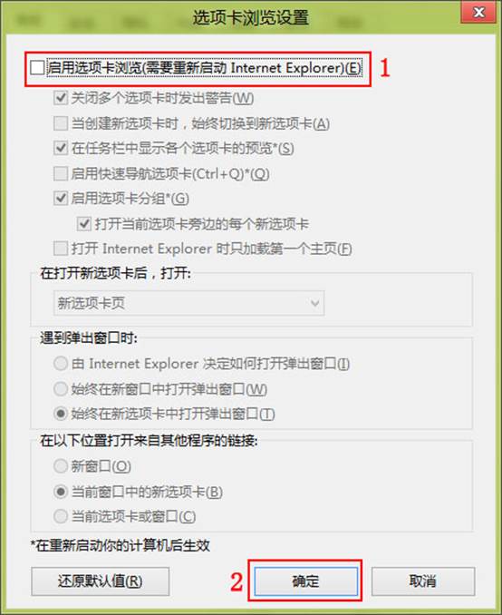 3、在彈出的選項卡瀏覽設置窗口,根據實際需要選擇開啟或關閉選項卡瀏覽功能。默認條件是開啟狀態,本次示例為取消勾選“啟用選項卡瀏覽(需要重新啟動Internet Explorer)”,并點擊“確定”按鈕。如下圖所示: