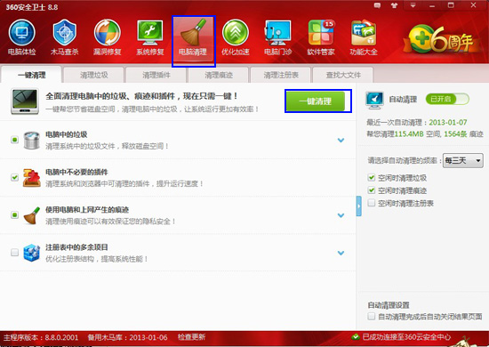 2、然后可以在網上下載一些清理軟件,比如360安全衛士,然后對電腦系統清除一些垃圾文件,打開360安全衛士,點擊【一鍵清理】即可完成操作了。只需要一鍵就清除了哦。如圖所示: