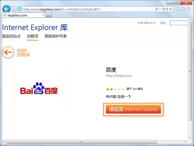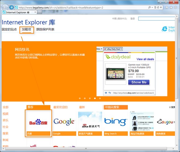 2、開啟微軟的網站后,可以在「加載項」中找到各種 IE瀏覽器的延伸工具來用,找到「百度」項目后,用鼠標左鍵按一下圖示。
