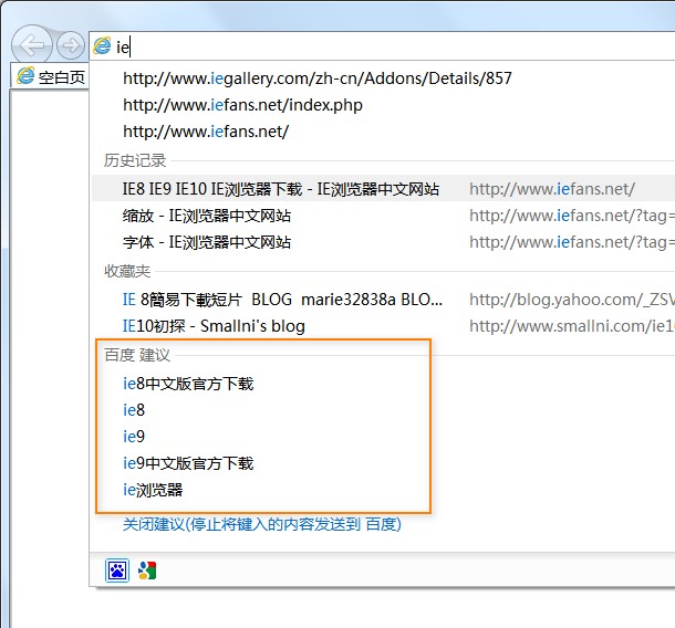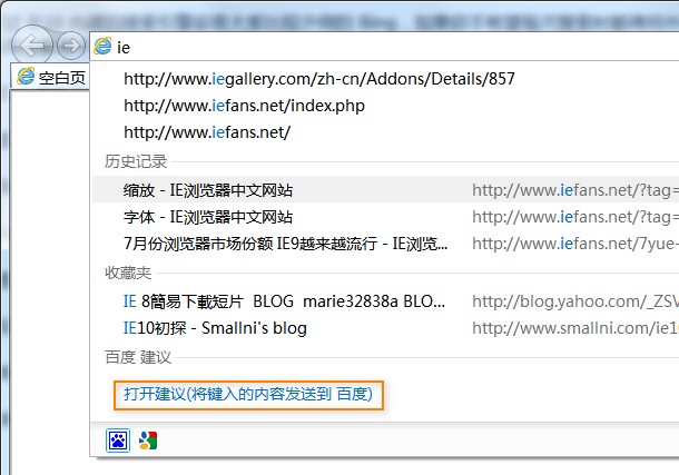 6、全部弄好后,以后當我們在 IE網址欄輸入網址、名稱或關鍵字時,下拉選單中會自動出現一些你可能會用得到的、自動出現的關鍵字,點一下關鍵字即可馬上搜索你要的相關資訊。
