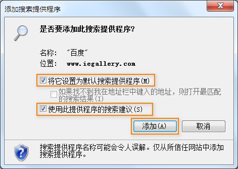 4、分別勾選「將它設置為默認搜索提供程序」與「使用此提供程序的搜索建議」兩個選項,然后再按「添加」。