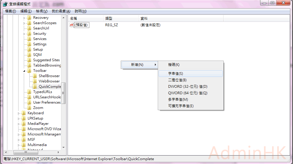 3. 在右邊框的空白位置,按右鍵 ->2 「新建」->2「字符串值」,再次輸入「QuickComplete」