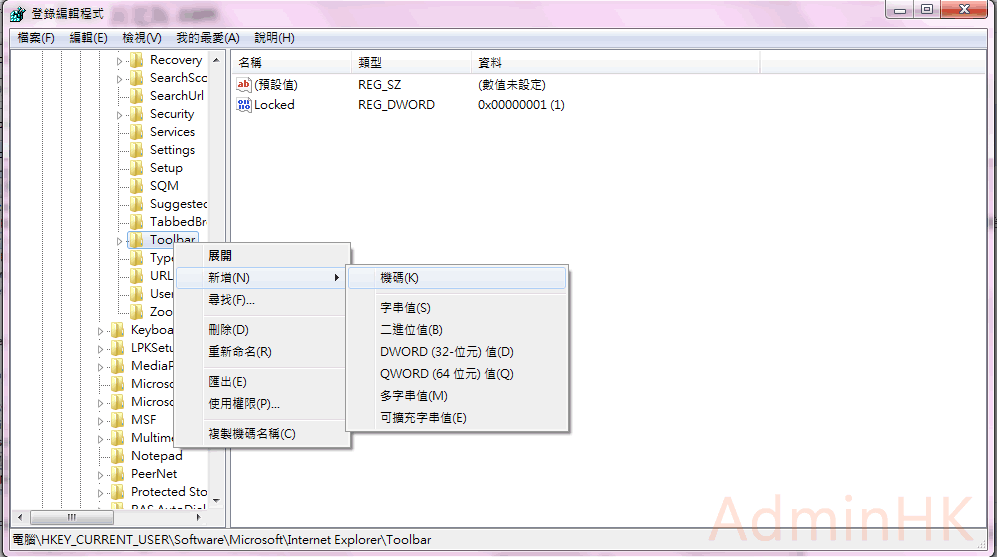 2. 依次展開: HKEY_CURRENT_USER ->2 Software ->2 Microsoft ->2 Internet Explorer ->2 Toolbar (如下圖)
