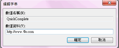 4. 雙擊剛剛在右邊建立的這個「字串值」,輸入「http://www.%s.com」 ->2 按「確定」