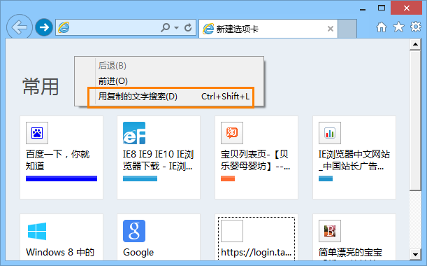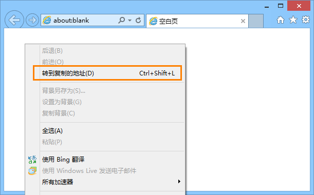 在IE10中,我們就可以直接在新建選項卡常用網頁中單擊右鍵使用“粘貼并轉到”這一功能了,同時在 about:blank 空白頁中也可以進行同樣的操作。