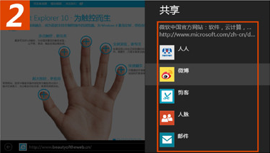 當(dāng)你瀏覽到精彩的網(wǎng)頁內(nèi)容時,你可以通過 IE10 的共享功能,把網(wǎng)頁內(nèi)容甚至整個網(wǎng)頁通過人人、新浪微博等你所熟悉的應(yīng)用,分享給周圍的朋友。