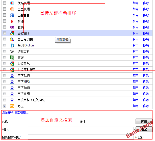 添加、刪除、修改、排序、自定義搜索引擎,如下圖: