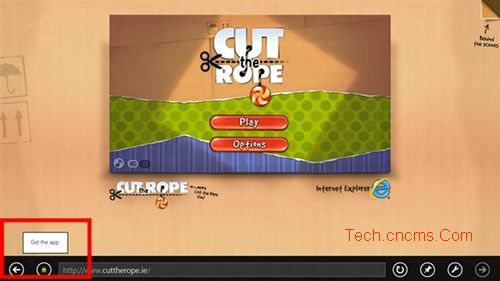 和iOS及其他通過注冊協議前綴調用第三方應用類似,如果在Windows 8 Style IE10中瀏覽在Windows應用商店有應用的網頁時會提示“獲得該應用”按鈕,點擊即可跳轉到微軟官方的Windows應用商店下載該應用。即用戶可以很方便的在IE中發現、下載和啟動適用于所訪問網站的Windows 8 Style風格應用程序。
