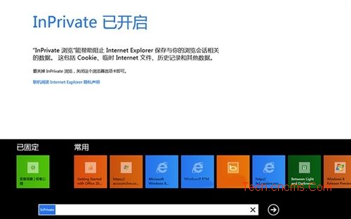 Windows 8 Style IE10在安全和隱私上也具有桌面版的SmartScreen、XSS過濾和InPrivate瀏覽功能。另外在新建標簽頁下會提示您經常訪問和已附加的網站,便于訪問常用網站。