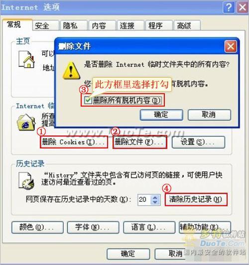 第二步:點擊刪除文件,將“刪除所有脫機內容”方框中打上勾后再點擊確認;