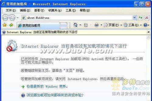 再次通過這個快捷方式打開瀏覽器時,你會發現,所有的加載項都沒有了,并且瀏覽器會自動返回“禁用加載項的狀態下運行”的提示(圖2)。