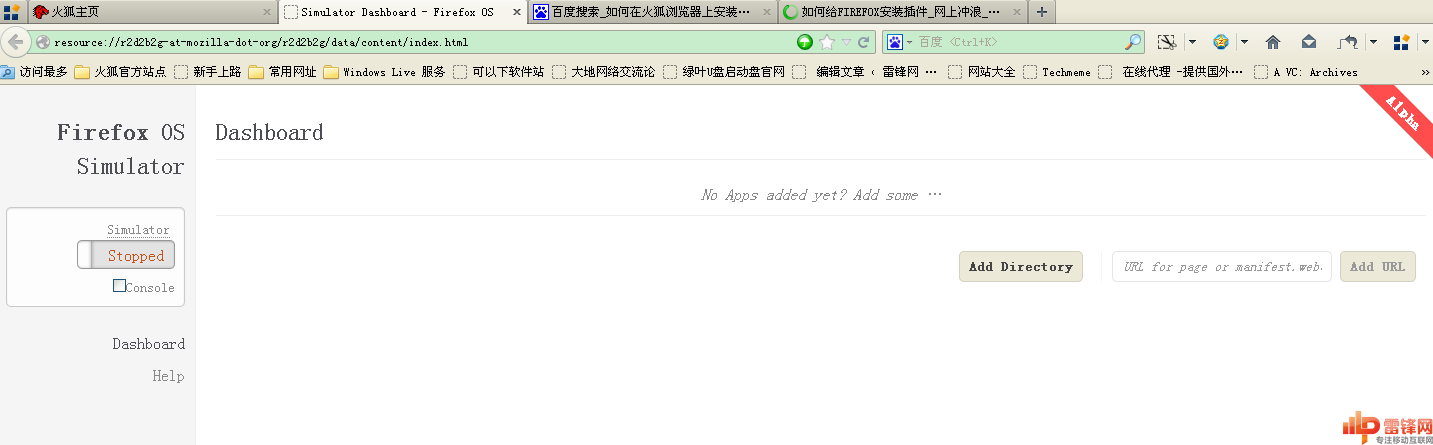 2.安裝完成后,會(huì)自動(dòng)轉(zhuǎn)入Firefox OS Simulator的控制板(dashboard),如下圖,點(diǎn)擊左上方的“Stopped”按鈕切換至“Running”。