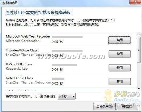 點(diǎn)擊界面右上角的齒輪圖標(biāo),從菜單中選擇“管理加載項(xiàng)”,在加載項(xiàng)列表中找到“迅雷”類別,選中迅雷相關(guān)加載項(xiàng),單擊界面下方的“禁用”按鈕,問題即可解決。