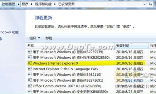 卸載IE9需要在“程序和功能”控制面板中單擊左側(cè)的“查看已安裝的更新”。在列出的更新程序列表找到IE9,單擊“卸載”按鈕即可。與此同時(shí),IE的語言包同時(shí)也會被卸載。