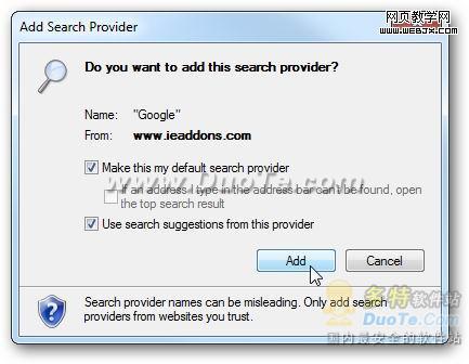 如上的窗口會出現,選擇 Make this my default search provider,以及 Use search suggestions from this provider,點 Add。