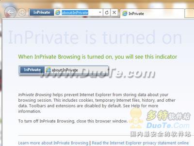 通過啟用InPrivate瀏覽模式,任何網頁在被用戶瀏覽時,都要遵循InPrivate瀏覽規則:瀏覽歷史、Cookies、臨時文件、以及其他數據都不會寫入硬件驅動中了。