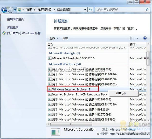 在“卸載更新”窗口,找到Windows Internet Explorer 9 這一項,右鍵看到“卸載”,點擊它,即可開始卸載IE9了,卸載完成后,重啟電腦,您的IE即可恢復到之前的版本了。
