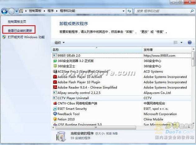 在“卸載或更改程序”窗口,點擊左邊的“查看已安裝的更新”,即可打開“卸載更新”窗口。
