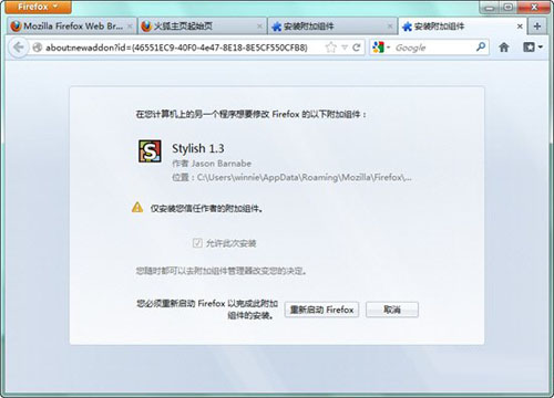 4、完成后,啟動Firefox;會看到兩個【安裝附加組件】的標簽,全部選中“允許此次安裝”后點擊繼續,最后點擊重新啟動Firefox。